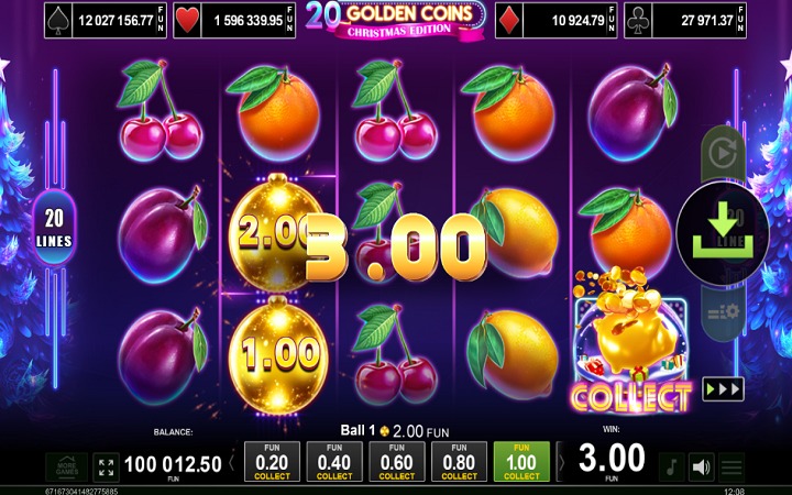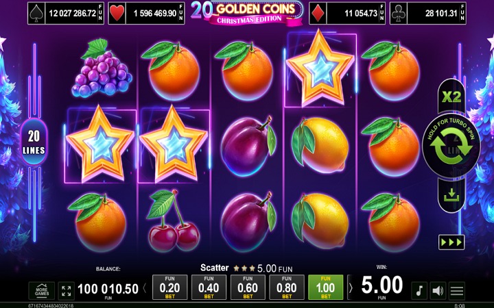 20 Golden Coins Christmas Edition je online slot koji ima pet kolona smještenih u tri reda i 20 isplatnih linija. Da biste ostvarili bilo kakav dobitak, potrebno je spojiti tri ili više odgovarajuća simbola na isplatnoj liniji.