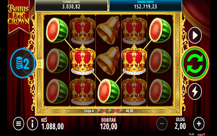 Bonus Epic Crown je online slot koji ima pet kolona smještenih u tri reda i ima 10 fiksnih isplatnih linija. Tokom besplatnih spinova broj isplatnih linija se povećava na 40. Da biste ostvarili neki dobitak potrebno je spojiti tri odgovarajuća simbola na isplatnoj liniji.