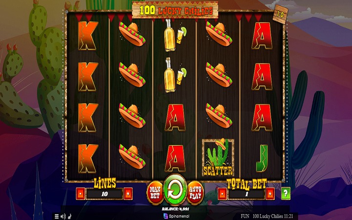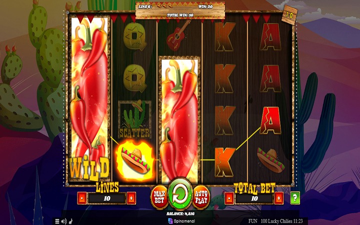 100 Lucky Chillies je online slot koji ima pet kolona raspoređenih u četiri reda i nudi čak 100 isplatnih linija. Linije su aktivne, a možete ih podesiti na: 10, 20, 30, 40, 50, 60, 70, 80, 90 ili 100.