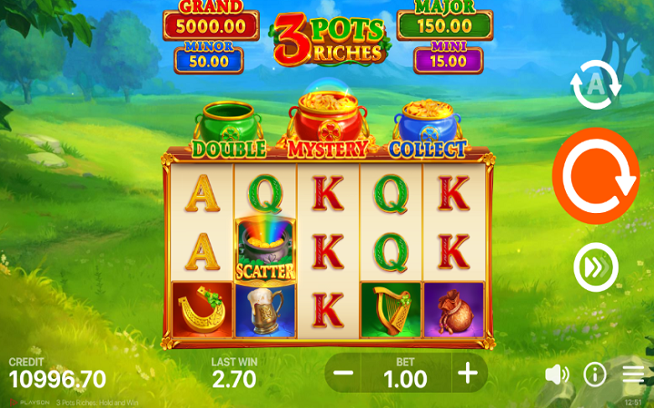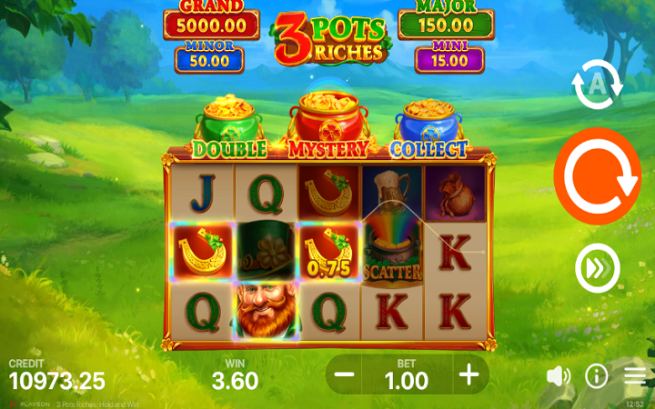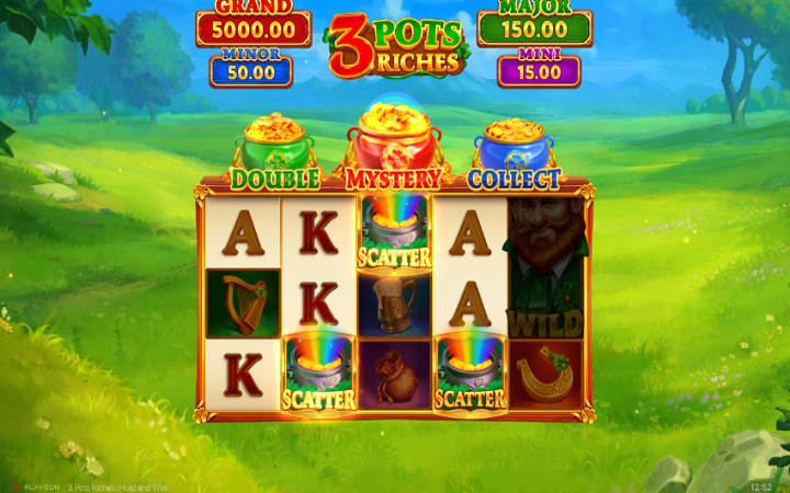 Postavka igre 3 Pots Riches Hold and Win je smještena na prelijepi pašnjak. Sve vrijeme dok se zabavljate slušaćete zvuke irske muzike.