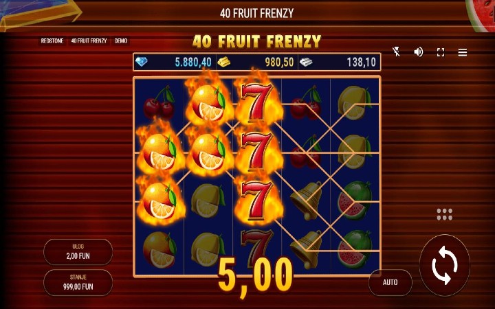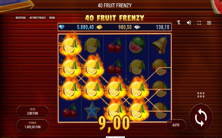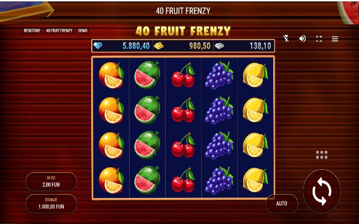 40 Fruit Frenzy je online slot koji je kreirao provajder Redstone. U ovoj online kazino igri vas očekuju tri progresivna džekpota. Tu su svakako džoker i sccater simboli. Maksimalni dobitak koji možete osvojiti je 1.000 puta više od uloga.