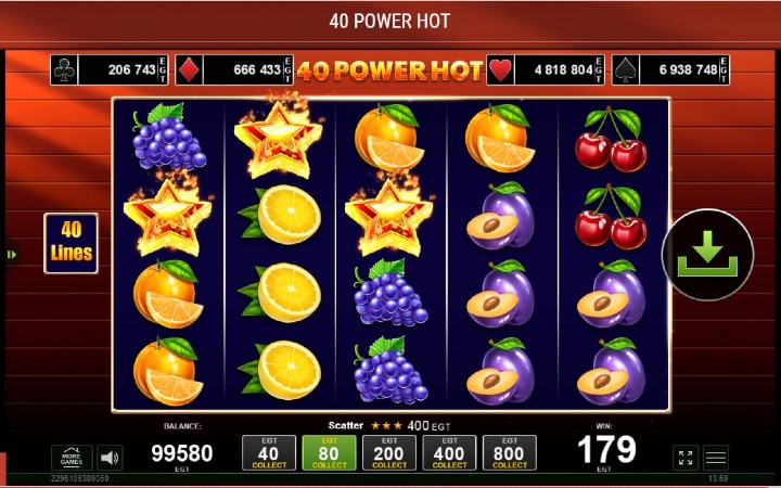 40 Power Hot je online slot koji ima pet kolona smještenih u četiri reda i ima 40 fiksnih isplatnih linija. Da biste ostvarili bilo kakav dobitak potrebno je spojiti tri ili više odgovarajuća simbola na isplatnoj liniji.