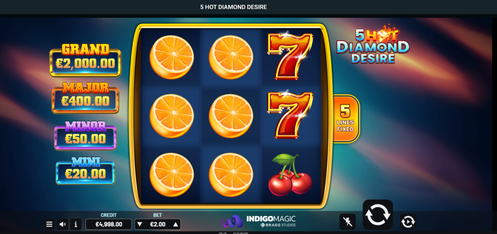 5 Hot Diamond Desire je odličan izbor za sve ljubitelje klasičnih slotova koji žele dodatni uzbuđenje kroz jackpot sistem. Jednostavna, brza i vizuelno atraktivna, ova igra donosi pravo kazino iskustvo uz šansu za velike nagrade.