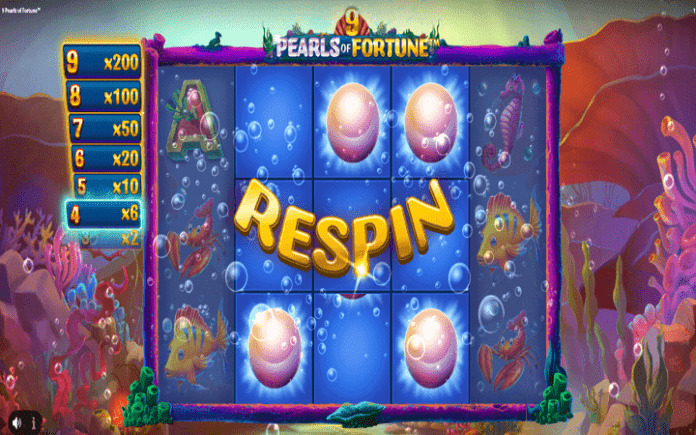 Slot 9 Pearls of Fortune posjeduje funkciju Pearl Respins, a kolone 2, 3 i 4 se pretvaraju u posebnu mrežu sa plavom pozadinom kad god 3 ili više bisera slete. Biseri se drže na svojim pozicijama dok se ostatak tih kolona okreće.