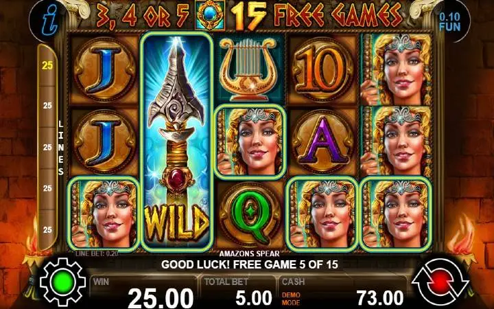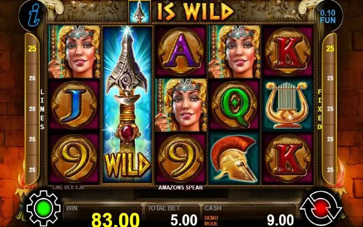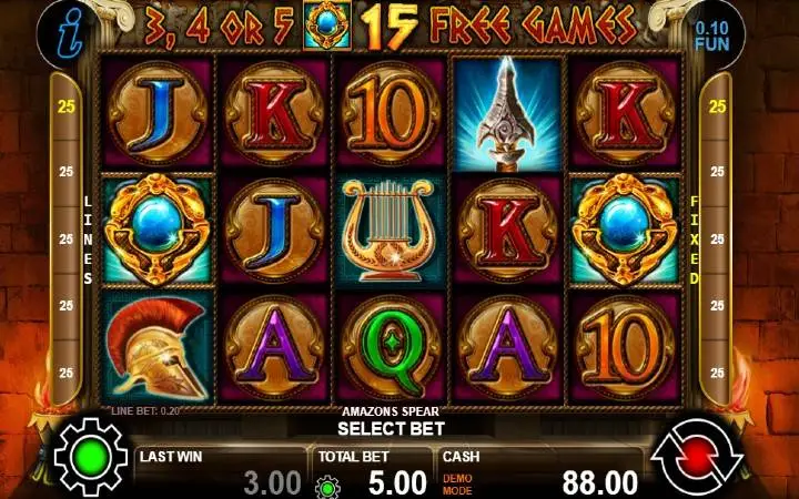 Amazons Spear je video slot koji ima pet kolona smještenih u tri reda i ima 25 fiksnih isplatnih linija. Da biste ostvarili bilo kakav dobitak potrebno je spojiti tri ili više podudarajućih simbola na isplatnoj liniji.