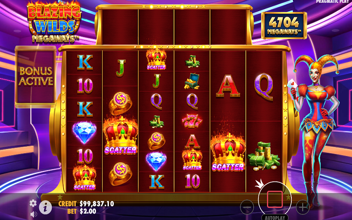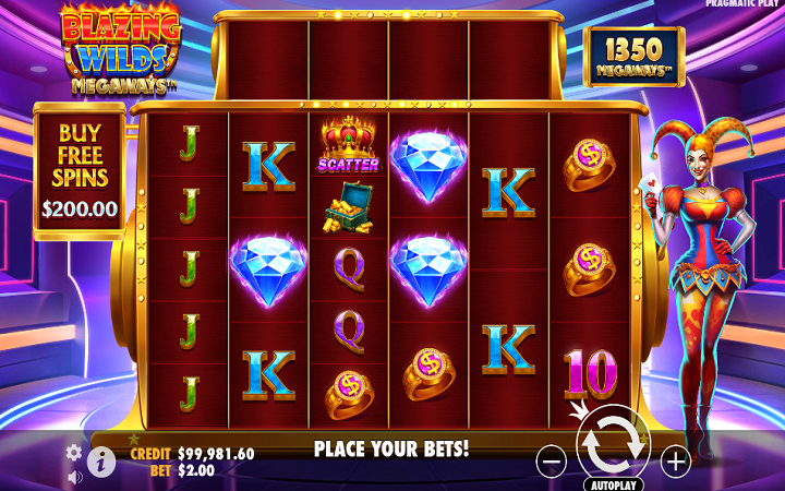 Kolone slota Blazing Wilds Megaways su smještene u objekat koji je ispunjen neonskom svjetlošću. Pored kolona ćete vidjeti ženu koja je obučena u dvorsku ludu.