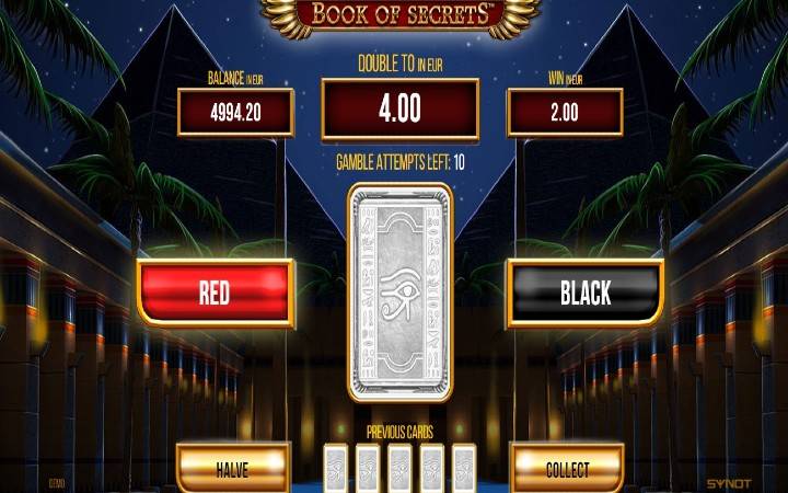 Igra Book of Secrets takođe ima funkciju kockanja, koja vam omogućava da odaberete da li ćete prikupiti ili kockati bilo koji dobitak, sa šansom da svaki put udvostručite svoju nagradu.