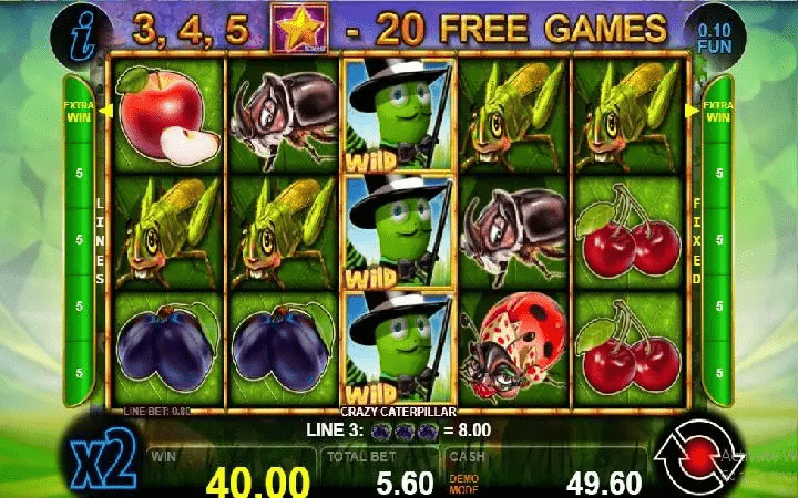 Postavka slota Crazy Caterpillar je na pet kolona u tri reda simbola i 5 isplatnih linija. Dobitne kombinacije zahtijevaju tri ili više identičnih simbola sa lijeve na desnu stranu.
