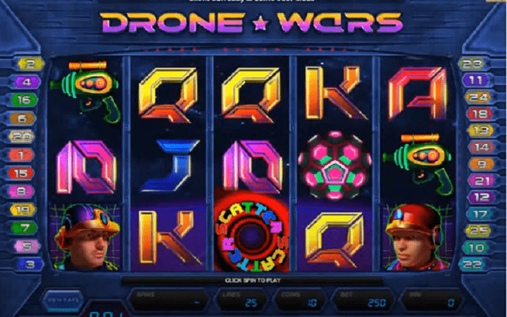 Kad je u pitanju online kazino igra Drone Wars ona dolazi sa 3 reda, 5 kolona i 25 isplatnih linija. Dok budete igrali ovaj video slot, kad skupite tri ili više scatter simbola, oni će sami pokrenuti igru Misija, a vi ćete imati priliku da odaberete jednu od dvije misije. Jedna od igara je Space Attack, ako se odlučite za nju bićete nagrađeni sa 5 besplatnih spinova.