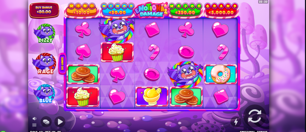 Kao i kod većine modernih slotova, simboli su pažljivo osmišljeni kako bi se uklopili u samu temu igre. Emotional Damage donosi šarenu kombinaciju slatkiša i emotivnih likova koji svojim izražajnim crtama lica daju posebnu notu zabave.