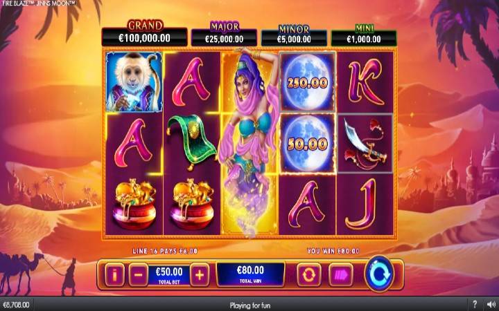 Fireblaze Jinns Moon je video slot koji ima pet rilova u tri reda i 50 isplatnih linija. Da biste ostvarili bilo kakav dobitak potrebna su vam tri podusarajuća simbola. Sve dobitne kombinacije se računaju slijeva udesno, počevši od prvog rila sa lijeve strane.