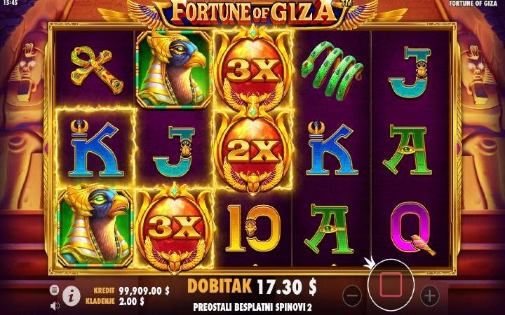 Fortune of Giza je video slot koji dolazi od proizvođača igara Pragmatic Play. U ovoj igri uživaćeš u sjajnim džokerima sa množiocima, koji tokom besplatnih spinova postaju ljepljivi simboli.
