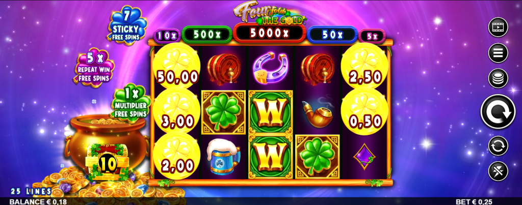 Fourfold the Gold je video slot sa 5 kolona (reelova) i 3 reda, dok igračima na raspolaganju stoji 25 fiksnih isplatnih linija.