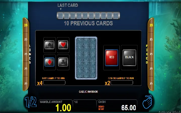 Slot Gaelic Warrior ima bonus igru Double Up, odnosno, igru kockanja. Da biste igrali igru kockanja potrebno je da ostvarite dobitak.