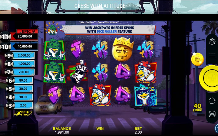 Geese With Attitude je online slot koji ima pet kolona smještenih u tri reda i ima 40 fiksnih isplatnih linija. Da biste ostvarili bilo kakav dobitak potrebno je spojiti tri ili više odgovarajuća simbola u dobitnoj kombinaciji.
