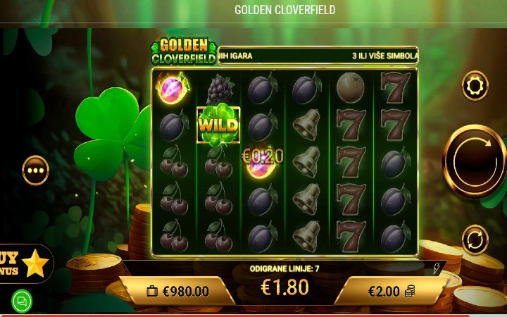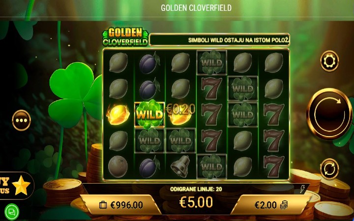 Golden Cloverfield je online slot koji ima šest kolona smještenih u pet redova, a igra ima 50 isplatnih linija. Da biste ostvarili bilo kakav dobitak potrebno je da spojite tri ili više odgovarajućih simbola na isplatnoj liniji.