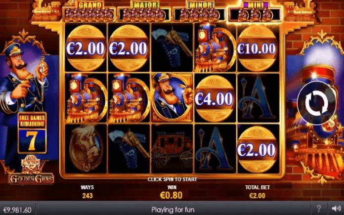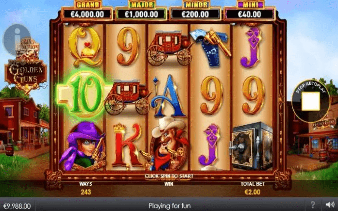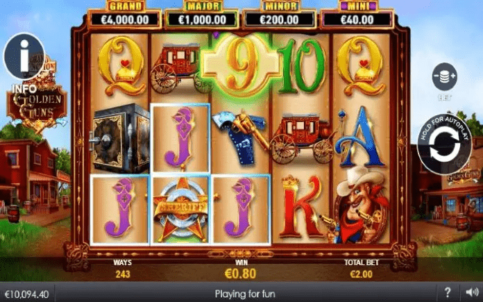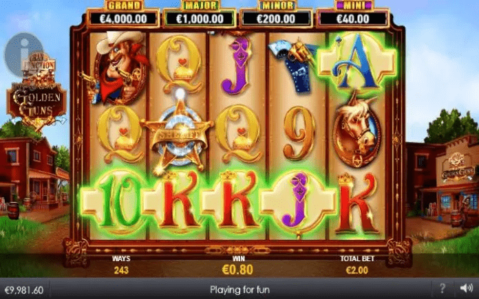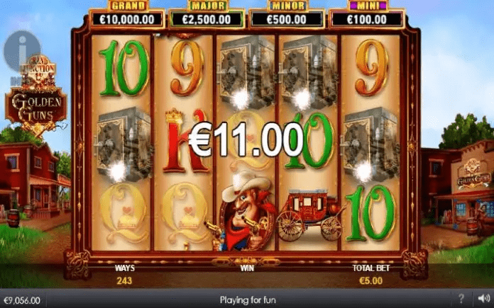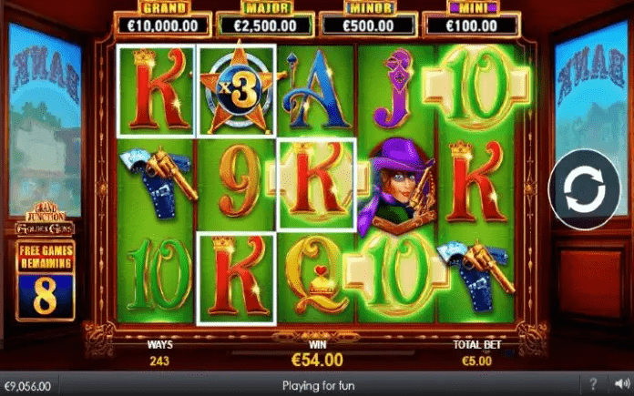 Golden Guns Grand Junction je online slot koji ima pet kolona smještenih u tri reda i ima 243 dobitne kombinacije. Da biste ostvarili bilo kakav dobitak potrebno je spojiti tri ili više podudarajućih simbola u dobitnom nizu.