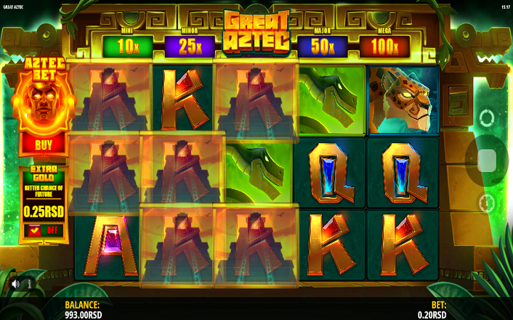 Kroz Extra Gold opciju povećavate vrijednost uloga, ali su frekvencije pojavljivanja bonus i džekpot simbola znatno češće. Na raspolaganju su vam: Mini (x10), Minor (x25), Major (x50) i Mega (x100)