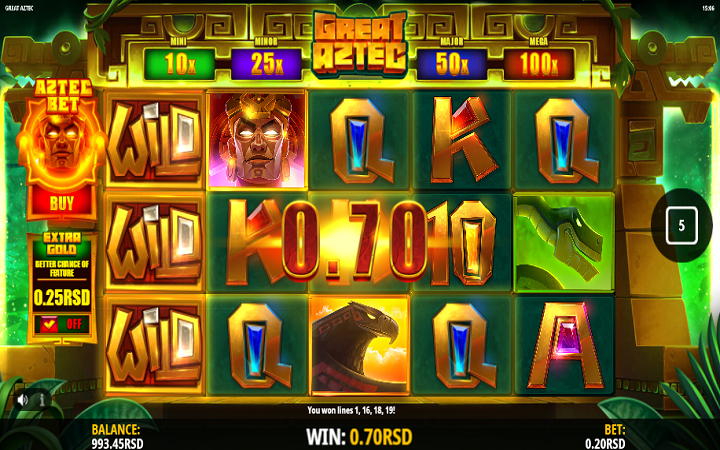 Great Aztec je video slot koji ima pet kolona smještenih u tri reda i ima 20 fiksnih isplatnih linija. Da biste ostvarili bilo kakav dobitak potrebno je spojiti tri ili više odgovarajuća simbola na isplatnoj liniji.
