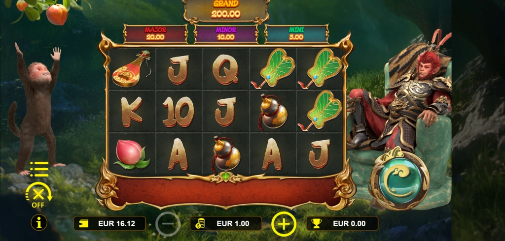 U donjem lijevom uglu nalazi se veseli mali majmun koji reaguje na dobitke i vrtnje, dok na desnoj strani sedi ozbiljniji, ratnički lik Kralja Majmuna koji nadgleda vašu igru. Ovi vizualni elementi čine igru živopisnom i interaktivnom, što povećava užitak pri svakom spinu.