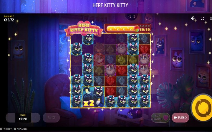 Here Kitty Kitty je video slot koji ima sedam kolona smještenih u sedam redova. O klasičnim isplatnim linijama ne možemo govoriti. Da biste ostvarili bilo kakav dobitak potrebno je da se pojavi minimum 12 identičnih simbola na kolonama.