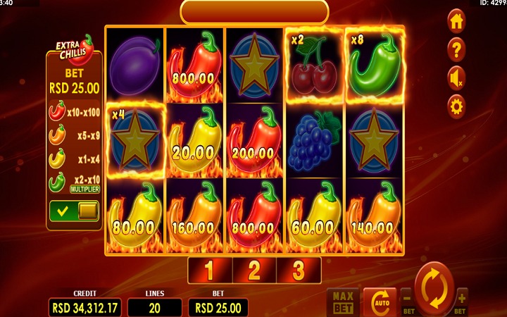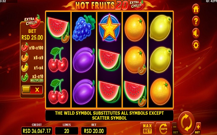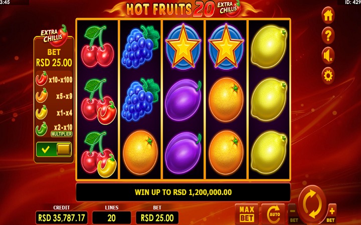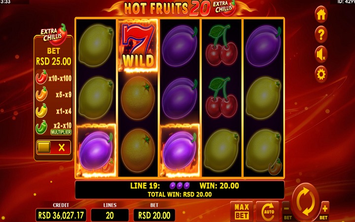 Hot Fruits 20 Extra Chillis je online slot sa pet kolona raspoređenih u četiri reda i 20 isplatnih linija. Da biste ostvarili bilo kakav dobitak, potrebno je spojiti tri ili više simbola u dobitnoj kombinaciji.