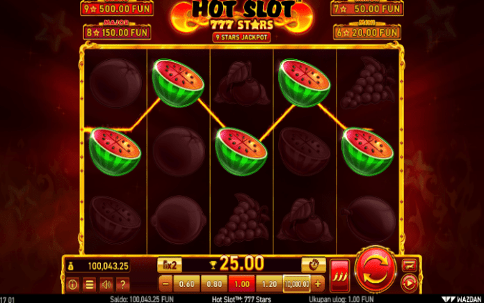 Hot Slot 777 Stars je klasičan slot koji ima pet kolona smještenih u tri reda i ima 20 fiksnih isplatnih linija. Da biste ostvarili bilo kakav dobitak potrebno je spojiti tri ili više odgovarajuća simbola na isplatnoj liniji.