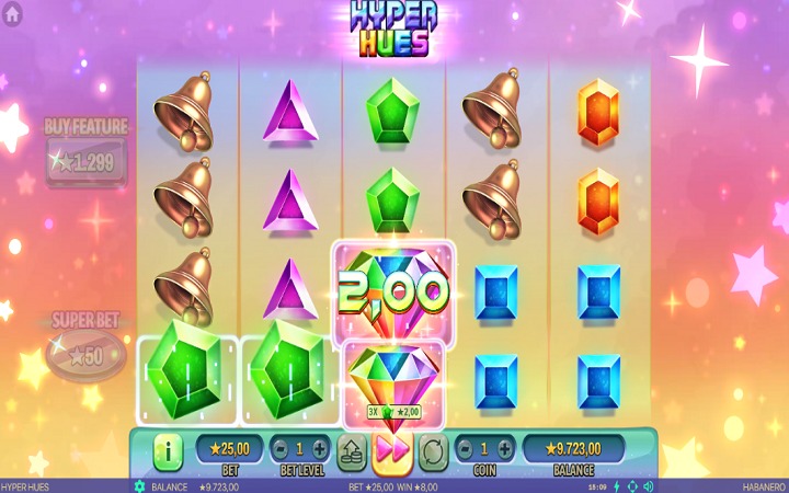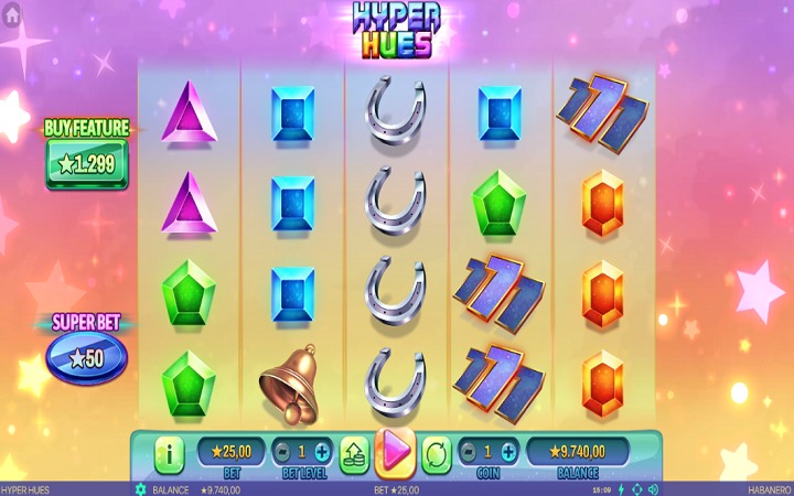 Hyper Hues je online slot sa pet kolona, smještenih u četiri reda i ima 50 fiksnih isplatnih linija. Da biste ostvarili bilo kakav dobitak, potrebno je spojiti tri ili više istih simbola na isplatnoj liniji.