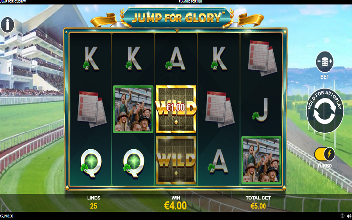 Jump For Glory je online slot koji ima pet kolona smještenih u tri reda i ima 25 fiksnih isplatnih linija. Da biste ostvarili bilo kakav dobitak potrebno je spojiti minimum dva ili tri odgovarajuća simbola na isplatnoj liniji.