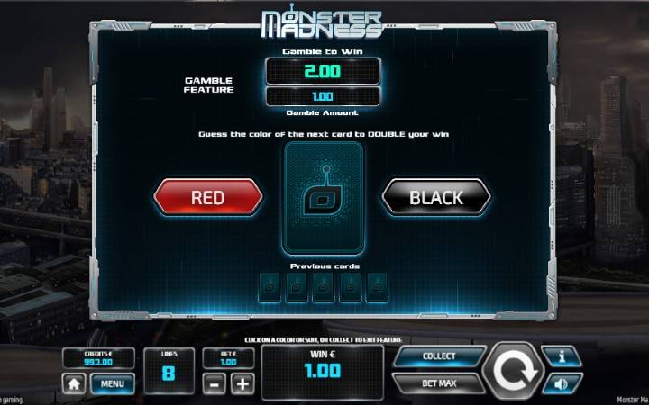 Takođe, treba napomenuti da video slot Monster Madness posjeduje i funkciju Gamble, odnosno kockanje. Tokom ove funkcije igrači imaju mogućnost da udvostruče svoje dobitke pogađanjem boje sledeće karte. Dostupne boje za pogađanje su crvena i crna, a šanse za dobitak su 50/50.