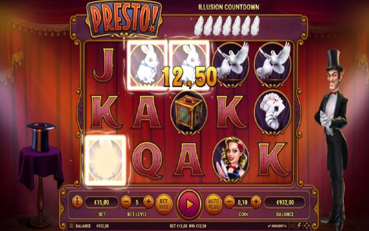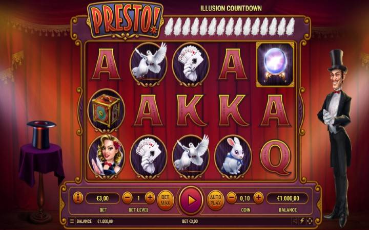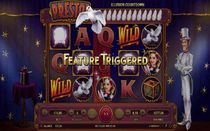 Video slot Presto ima zabavne karakteristike. Jedna od njih je i ” Odbrojavanje iluzija”. Zanima vas šta je to? Na vrhu slota ćete primjetiti perje koje pada nakon svakog pokrenutog spina. Može biti između 5 i 20 ovih pera na vrhu slota. To padanje perja predstavlja odbrojavanje, a kada zadnje pero pade pokreće se jedna od pet bonus igara.