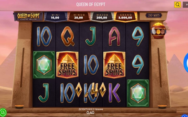 Queen of Egypt Exotic Wilds je video slot koji ima pet kolona smještenih u tri reda i ima 243 načina za dobitak. Da biste ostvarili bilo kakav dobitak potrebno je spojiti tri ili više odgovarajuća simbola na isplatnoj liniji.