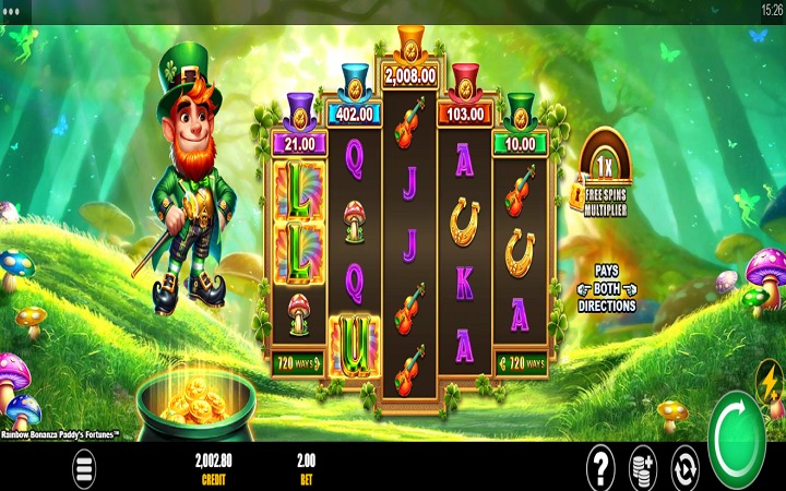 Postavka slota Rainbow Bonanza Paddy’s Fortunes smještena je u prelijepi pejzaž ispunjen drvećem i pečurkama. Tradicionalna irska muzika prati vas tokom cijele igre.