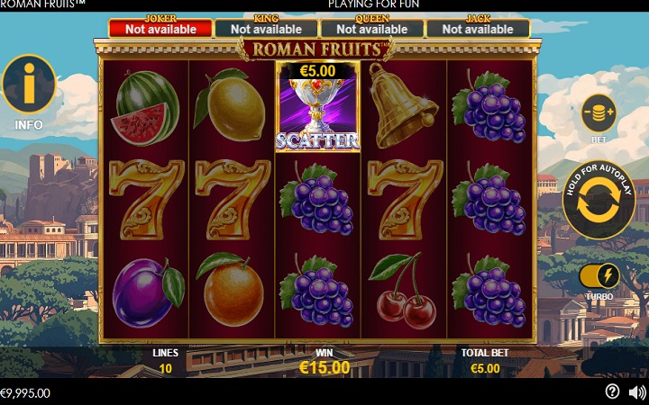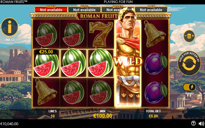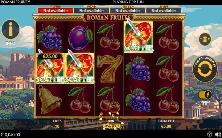 Roman Fruits je online slot koji ima pet kolona smještenih u tri reda i 10 fiksnih isplatnih linija. Da biste ostvarili bilo kakav dobitak, potrebno je spojiti minimum dva ili tri odgovarajuća simbola na isplatnoj liniji.