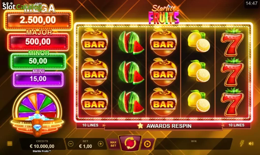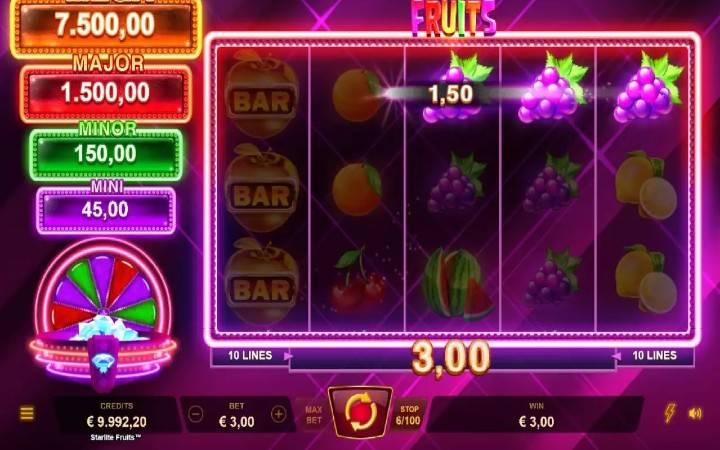 Starlite Fruits je video slot, smješten u 5 kolona i 3 reda, sa 10 isplatnih linija. Ovo je igra srednje volativnosti, sa RTP-om od 96%.