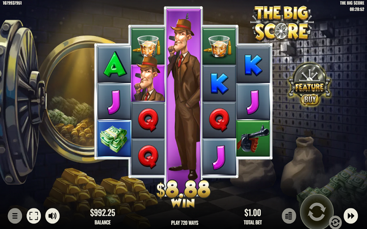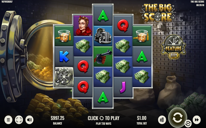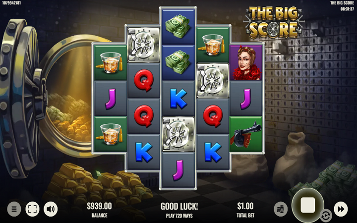 Kolone slota The Big Score su postavljene ispred bankovnog trezora. Ispod kolona ćete vidjeti veliku količinu novca i zlata. Zanimljiva muzika je prisutna sve vrijeme dok se zabavljate.