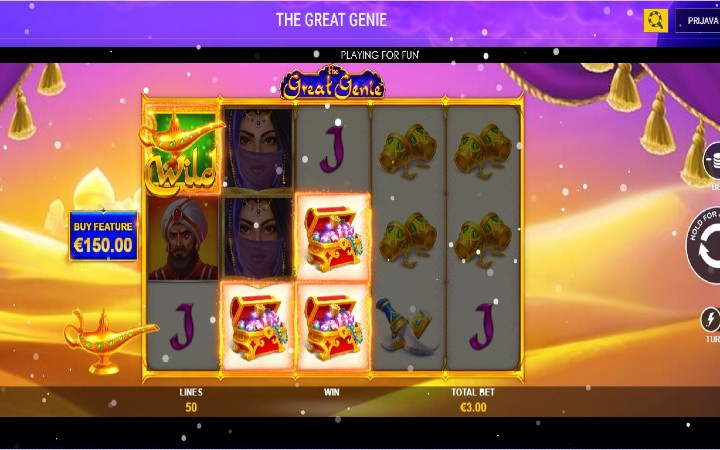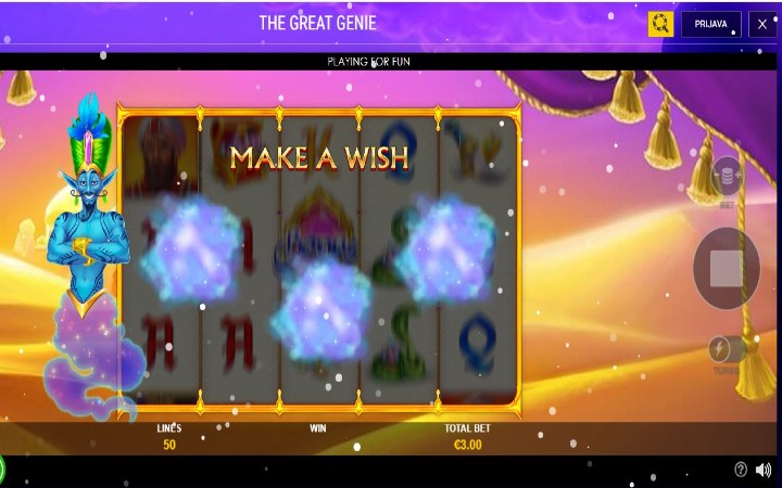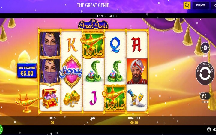 The Great Genie je online slot koji ima pet kolona smještenih u tri reda i ima 50 isplatnih linija. Da biste ostvarili bilo kakav dobitak potrebno je spojiti tri ili više odgovarajućih simbola na isplatnoj liniji.