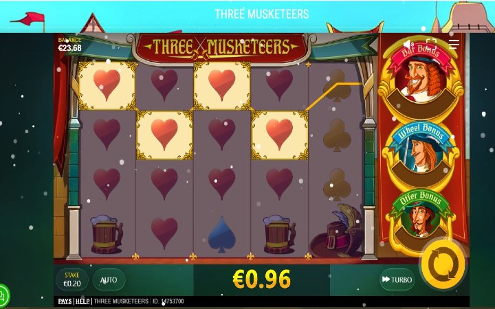 Three Musketeers je video slot koji ima pet kolona smještenih u četiri reda i ima 40 isplatnih linija. Da biste ostvarili bilo kakav dobitak potrebno je spojiti tri ili više odgovarajućih simbola na isplatnoj liniji.