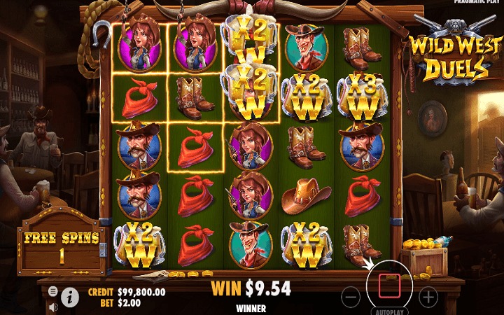 Duel Free Spins Bonus se aktivira sa tri scatter-a u obliku pištolja. Dobijate 10 besplatnih spinova tokom kojih se džokeri proširuju na čitavu kolonu. Na krajevima džokera nalaze se množioci, od kojih će jedan biti primijenjen na vaš dobitak.