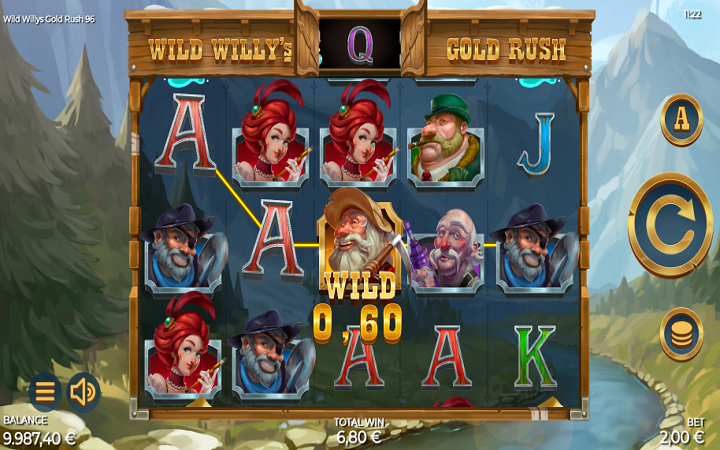 Wild Willys Gold Rush je online slot koji ima pet kolona smještenih u tri reda i ima 20 fiksnih isplatnih linija. Da biste ostvarili bilo kakav dobitak potrebno je spojiti minimum dva ili tri odgovarajuća simbola na isplatnoj liniji.
