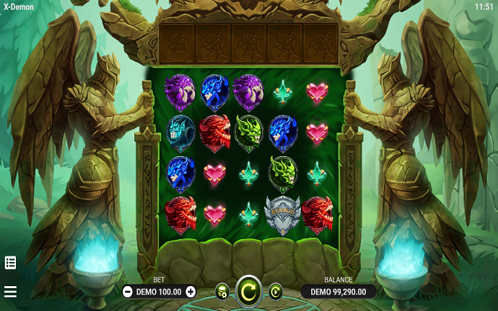 Postavka igre X Demon je smještena na kamenu podlogu. Ispod kolona ćete vidjeti dvije baklje svijetlo plavog plamena. Tokom besplatnih spinova i dizajn igre se mijenja.
