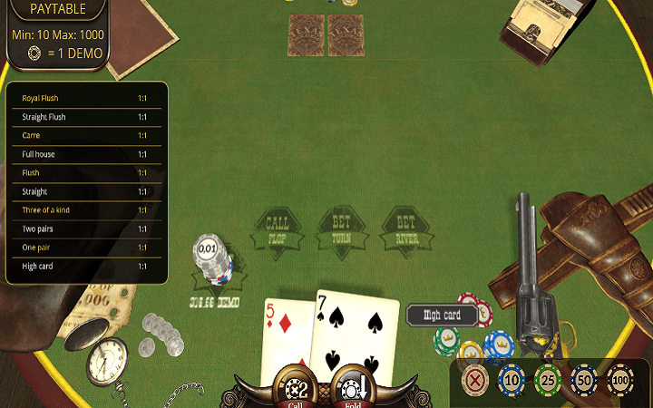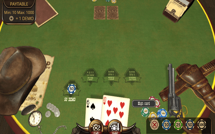Sa lijeve strane slota zapazićete kaubojski šešir, kao i džepni sat, koji možda ovog puta ide kao ulog, u jednoj od poker ruku, ispod šešira ćete imati priliku da zapazite mapu. Dok ćete sa desne strane stola imati priliku da zapazite kaubojski pištolj, kao i torbice koje će vam dobro doći za isti, naravno na stolu su karte kao i žetoni, sigurni smo da igra može odmah početi.