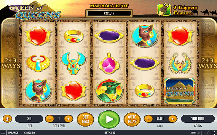 Video slot Queen of Queens 243 dolazi od proizvođača online kazino igara Habanero, ima egipatsku mitologiju na dlanu a centralna figura je kraljica Kleopatra. Sve što vam treba da biste ostvarili dobitak jeste da poređate dva ili tri podudarajuća simbola u nizu. Klikom na taster sa munjom donosi vam dinamičniju igru i tada ćete aktivirati Quick Spin Mode. Autoplay funkcija je dostupna i možeteje aktivirati u bilo kom trenutku. Simboli najmanje isplatne vrijednosti su tri dragulja ljubičaste, roze i crvene boje, kao i jedna ogrlica i prsten, a nakon njih slijedi simbol bube i egipatskog krsta koji donose duplo veću isplatnu moć.