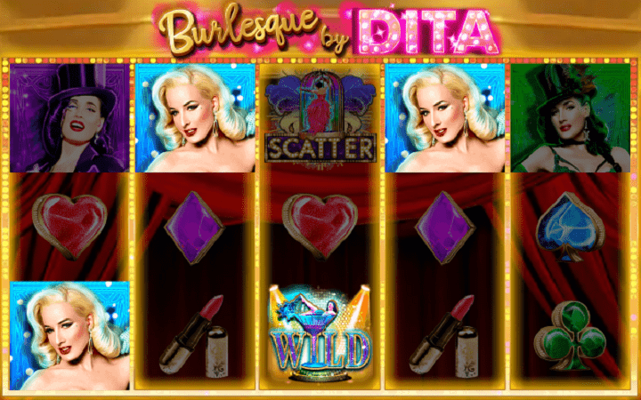 U video slotu Burlesque By Dita vas očekuju četiri simbola, na kojima se nalaze četiri prelijepe dame. Svaka je posebna i jedinstvena na svoj način, pa je samim tim proizvođač Microgaming odlučio da svaka ima različitu isplatnu vrijednost, dobitke koje omogućavaju obaraju sa nogu! Džoker simbol predstavljen je simbolom djevojke koja se nalazi u čaši za koktele, mijenja sve osnovne simbole na kolonama osim scatter simbola. Dok je scatter simbol djevojka predstavljena u rozoj haljini, i omogućiće vam bonus besplatne spinove.