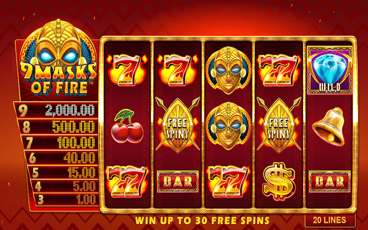 Drugi slot nosi naziv 9 Masks of Fire i vodi vas na putovanje u Afriku, samim tim odlučili smo da ovo bude baš druga igra za naš članak Afrika i ekskluzivni bonusi. Ono što će vas podsjećati na afrička plemena su muzika i dva scatter simbola koja se pojavljuju na kolutima – zlatna maska, tj. Mask Scatter, i Shield Scatter, odnosno štit, na kojem piše Scatter i koji pokreće funkciju Free Spins, tj. besplatne spinove. Simboli niže vrijednosti i to su dolari, zvona, barovi i trešnje i oni isplaćuju između 1.00 i 3.25 poena, ukoliko ih sakupite pet.