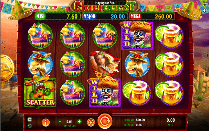 Naš članak smo odlučili da započenmo slotom Chili Quest koji nam dolazi od proizvođača online kazino igara GameArt, i donosi sjajnu čili zabavu džekpotova. Posjeduje pet kolona u tri reda i 25 isplatnih linija, koje su fiksne, što znači da njihov broj ne možete podešavati. Prvu grupu simbola čine kartaški simboli A, K, Q i J i ovo su simboli niže vrijednosti, pomoću kojih svoj ulog možete uvećati do 100 puta. Koktel, pinjata, magare i djevojka u zanosu čine simbole sa većom isplatnom vrijednošću. Ovi simboli omogućavaju i do 500 puta veće dobitke.