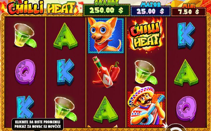 A jeste li spremni za čili zabavu uz zanimljive marijače? Ovakvu zabavu omogućio je proizvođač online kazino igara Pragamatic Play u slotu Chilli Heat. Simboli najmanje isplatne moći su klasični kartaški simboli: J, Q, K i A. Naredni simbol je čaša sa tekilom i limun pored nje. Pet ovih simbola na isplatnoj liniji donijeće vam četiri puta više od uloga. Simbol papričice i ljutog sosa od paprike donosi petostruko više od vrijednosti vašeg uloga za dobitnu kombinaciju od pet simbola. Simbol mačke je naredni simbol po isplatnoj moći. Meksikanac koji svira gitaru sa sombrerom na glavi simbol je najveće isplatne moći.