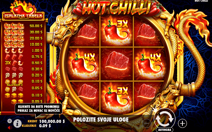 Najvrijedniji simbol slota Hot Chilli je simbol ljute papričice. Ovo je ujedno i džoker i on može zamjeniti sve simbole osim simbola tofua. Simbol čili papričice se javlja u četiri oblika, kao simbol sa različitim množiocem na sebi: x2, x3, x4 i x5, samim tim, on nudi i različite isplate. Kao olakšica pri igranju, dostupan je režim Autoplay, kojim možete podesiti najviše 100 automatskih spinova. Dugme Autoplay, kojim pokrećete ovaj režim, se nalazi u komandnoj tabli, koja sadrži i dodatne alatke.
