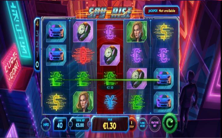 Na kolonama slota će vas dočekati simboli logotipa valuta evra, funte, dolara, bitkoina i japanskog jena, sa neonskim sjajem, ali nešto niže vrijednosti. Prate ih simboli veće isplatne vrijednosti u obliku skupocenih satova, sportskih automobila, i dva opasna špijuna. Simbol muškog špijuna je najunosniji i nagradiće vas sa 50 puta više od uloga, za pet istih na liniji.