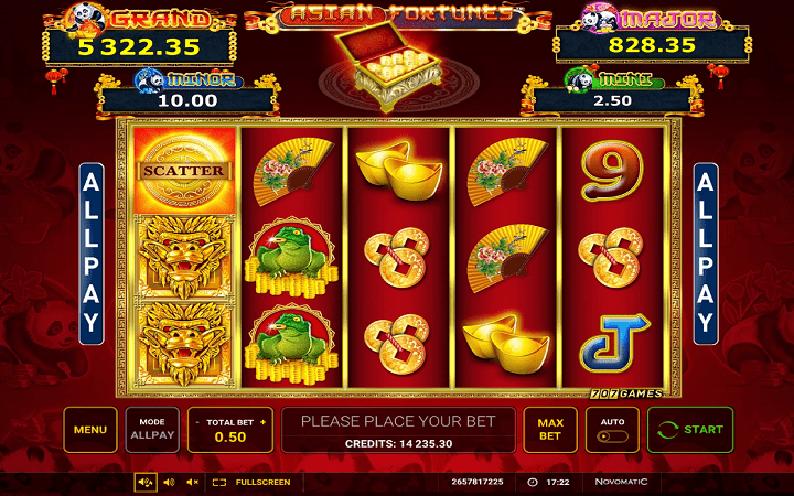 Druga kazino igra koju smo pripremili za naš članak Osvojite velike dobitke uz kazino igre jeste Asian Fortunes i predstavio je proizvođač Novomatic-Greentube. Ovaj sladak video slot se nalazi na pozadini od crvenih tapeta na kojima se vide šašave pande. Iznad table sa rilovima možemo vidjeti neke lijepe cifre. U pitanju su četiri džekpota, a kako da ih osvojite objasnićemo malo kasnije! Od simbola se javljaju klasični kartaški simnoli u vidu slova A, J, K, Q, ali i broj 10, srećni novčići, posudice sa novčićima, lepeza, žaba i glava zlatnog zmaja.